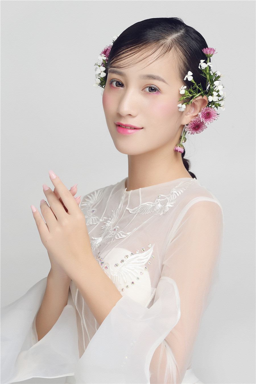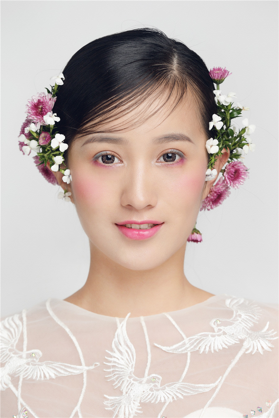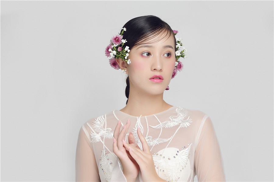 麗竹學(xué)校彩妝作品---花樣鮮花新娘:鮮花打造的新娘頭飾,展現(xiàn)美顏動(dòng)人的一面。嬌艷的鮮花點(diǎn)綴于發(fā)絲之上,襯托新娘更加美麗嬌嫩。