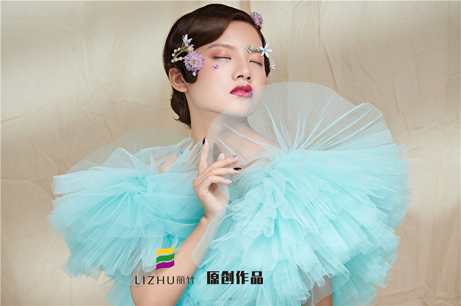 藍(lán)色輕紗加上妝容花朵點(diǎn)綴
