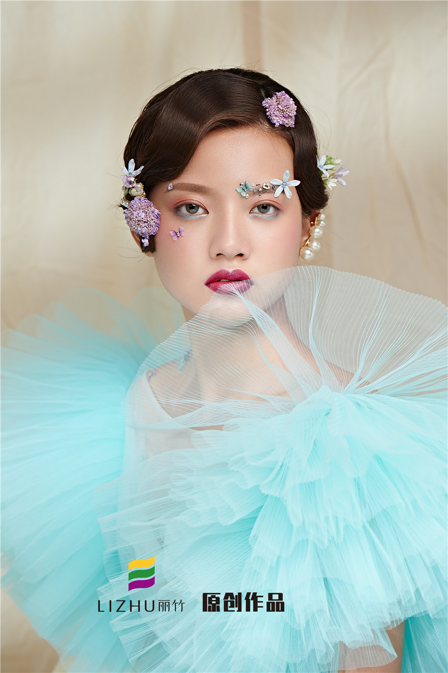 麗竹學(xué)校彩妝作品---氣質(zhì)名媛造型:藍(lán)色輕紗加上妝容花朵點(diǎn)綴,頭飾與發(fā)型的完美搭配,流淌出輕柔舒緩之美,簡約自然的情緒態(tài)度。