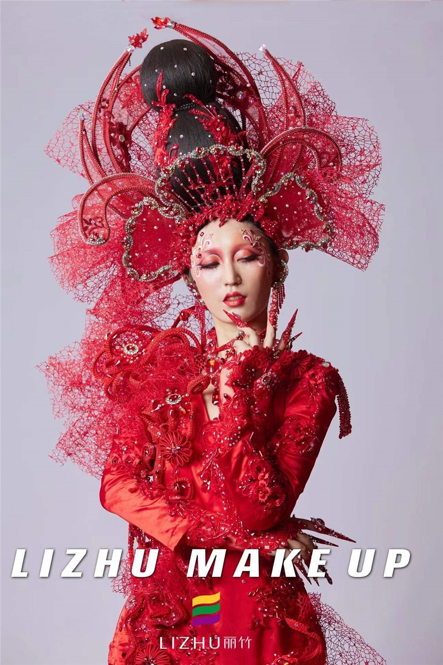南寧彩妝造型培訓(xùn)學(xué)校創(chuàng)意彩妝作品---戰(zhàn)姬:這款整體造型以“中國紅”為主色,修身的魚尾裙擺設(shè)計(jì)配以水鉆、刺繡和精致的頭飾,妝面以紅色為主,運(yùn)用簡單線條描繪以及大面積暈染的手法處理,妝面與服裝、頭飾相呼應(yīng),視覺沖擊十足。
