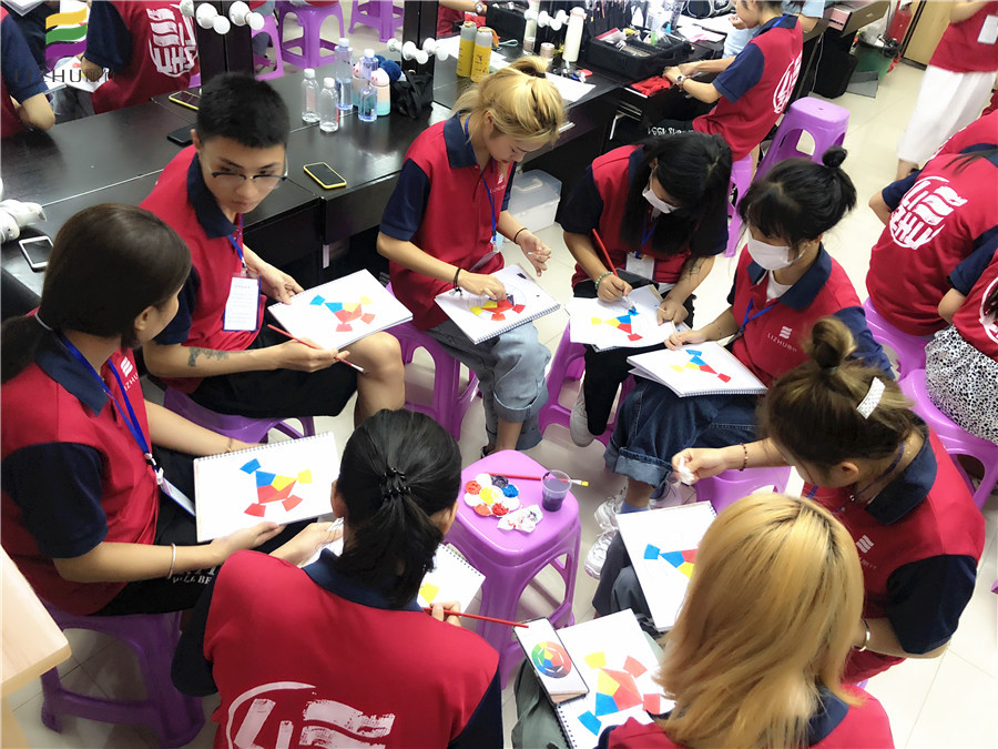 同學(xué)們分成幾個(gè)小組圍坐在一起,根據(jù)老師上課講解的色彩搭配內(nèi)容,正在互相討論,互相互助進(jìn)行紙上色彩搭配練習(xí)。