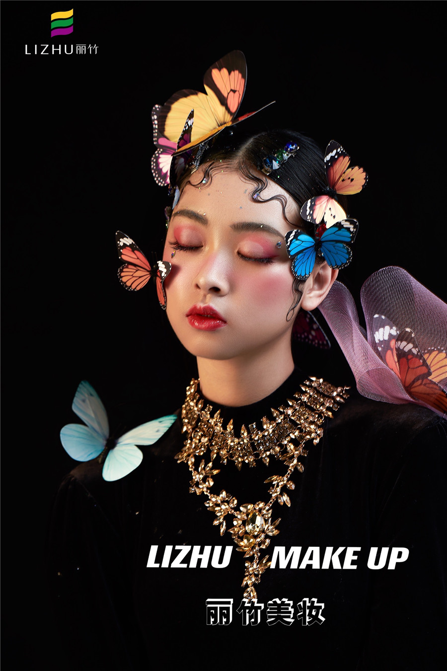 麗竹化妝學(xué)校作品---創(chuàng)意蝴蝶妝容:肩頭兩鬢和眼前額頭,被五彩斑斕的蝴蝶點(diǎn)綴,強(qiáng)烈的黑色背景搭配亮眼色差,產(chǎn)生了很強(qiáng)的視覺(jué)效果,讓人過(guò)目不忘之余,更寓意破繭成蝶涅槃重生的狀態(tài)。
