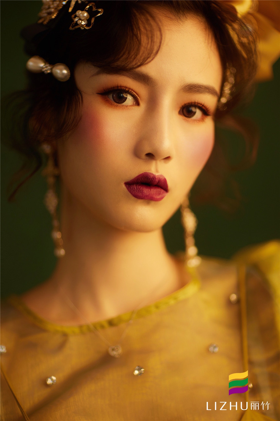 油畫妝容造型:復(fù)古手推波營造的優(yōu)雅感,佩戴金光亮閃的珍珠頭飾,極具張力的色系妝容打造,營造出了古典優(yōu)雅韻味,又不可抗拒的文藝氣息,如油畫里走出來的女王。