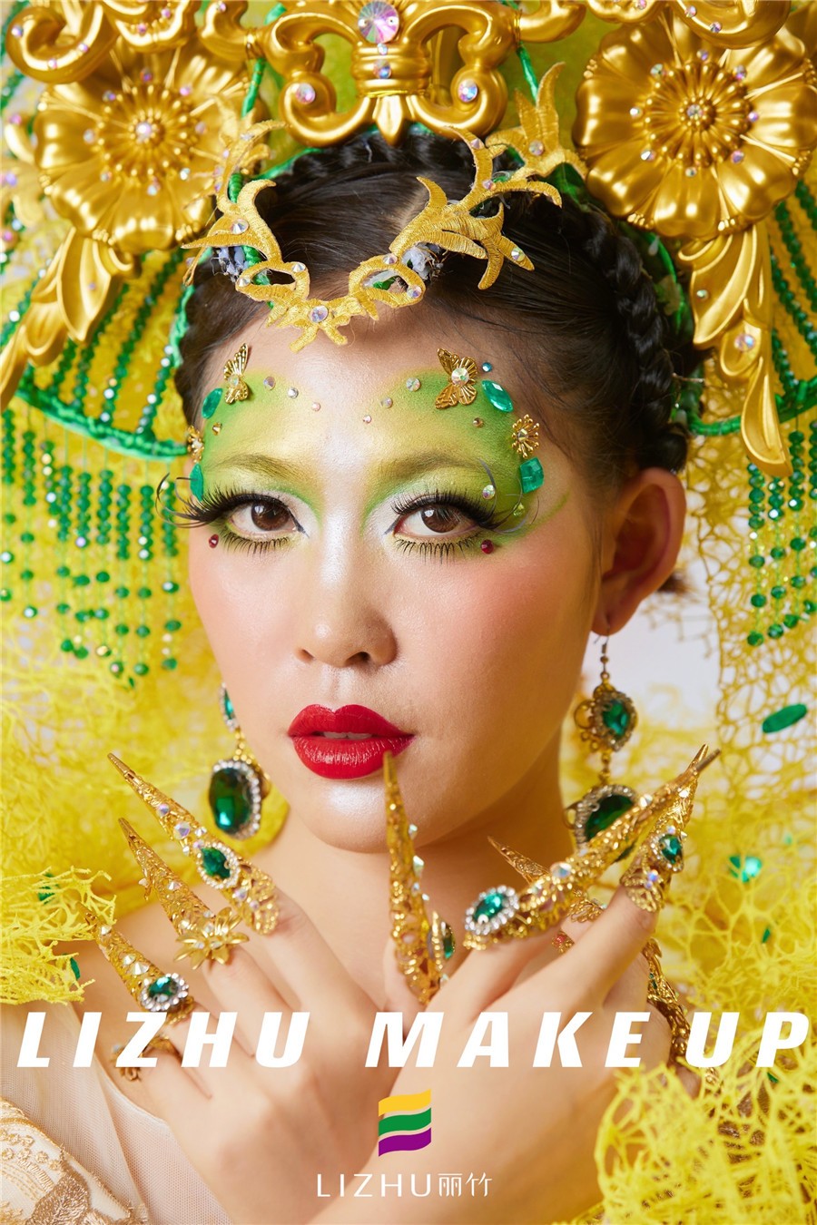 南寧化妝學(xué)校創(chuàng)意彩妝作品---綠野仙蹤:作品整體造型采用綠色與黃色相碰撞,突顯出了大氣神秘、富貴、極富時(shí)尚感的妝造氣質(zhì)。而選擇綠色的眼影色,則暈染展現(xiàn)出了女性的冷艷。視覺強(qiáng)烈的大紅唇,體現(xiàn)女性特有的妖嬈與性感,在利用金色裝飾品點(diǎn)綴妝容,使其襯托下整體視覺感更加突出。