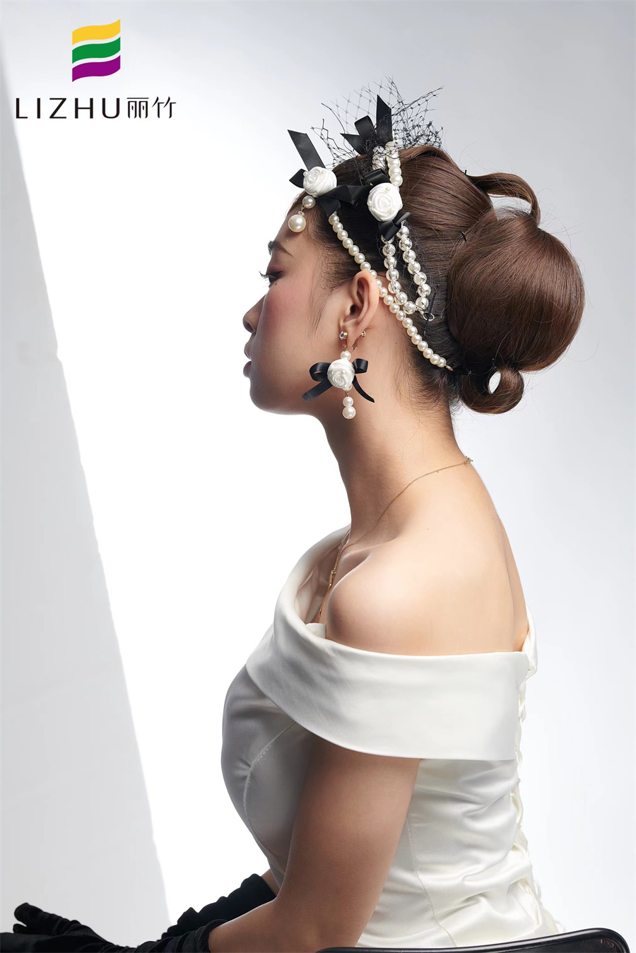 麗竹化妝盤札發(fā)造型班作品---“赫本頭”發(fā)型:做赫本頭頭的高發(fā)髻時,比較合適的位置是在下頜的延長線上。發(fā)髻的大小也要根據(jù)臉型的大小來決定,切勿過大或過小,以免顯得比例不平衡。佩戴飾品的位置居中,這樣看起來才能使整個發(fā)型更加高貴和典雅!