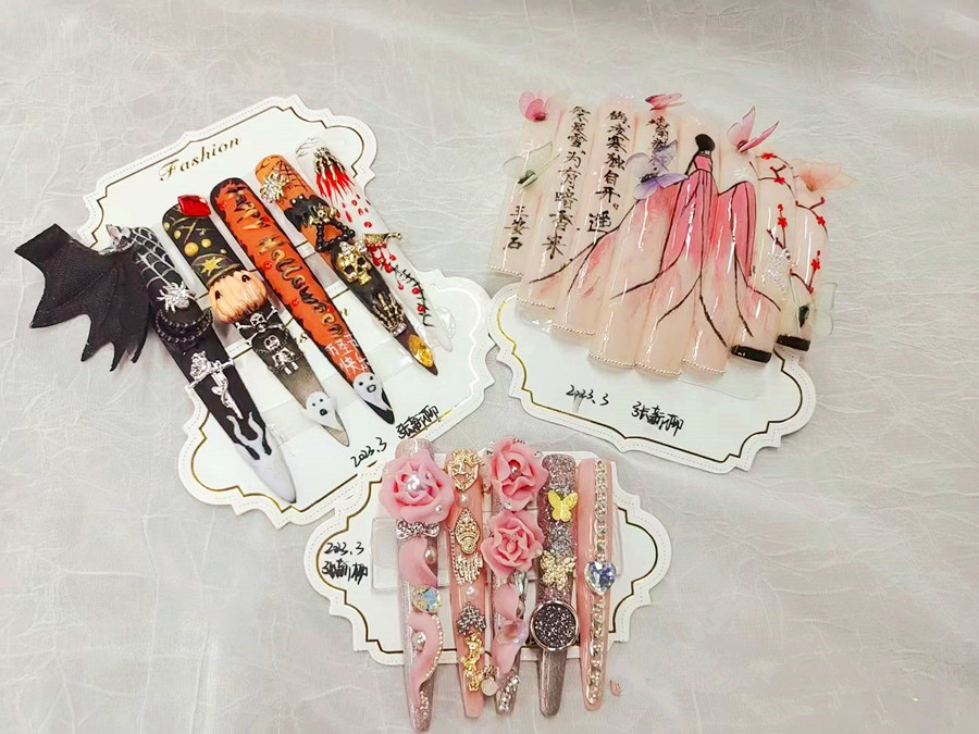 美甲基礎(chǔ)知識內(nèi)容---沙龍甲也就是藝術(shù)沙龍甲,指尖上的藝術(shù)。在特長的指甲片上用彩繪、貼飾品、雕花等手法制作出各種風格,可以是華麗富貴、水墨國畫風、可愛的萌寵風、漫畫人物還能是立體的花卉等等,它玩的就是創(chuàng)意,可以一個單獨成為一個作品,也可以幾個連在一起成為一副作品。