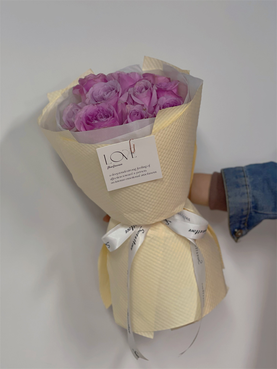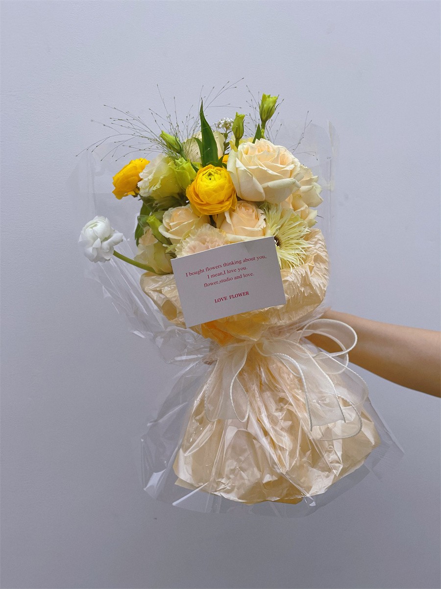 在進(jìn)行圓形花束的制作時(shí),在確定主花后,便可以按照螺旋的方式一次添加花材,使得整束花看起來飽滿之后,稍作調(diào)整成為一個(gè)圓形的輪廓,然后便可以用繩子在根部綁好進(jìn)行修剪。花材處理好了之后,將包裝紙裁剪出適當(dāng)?shù)拇笮。缓蟾鶕?jù)花的形狀包裹起來,用彩帶幫緊并打成一個(gè)蝴蝶結(jié),這樣圓形小花束就完成了。