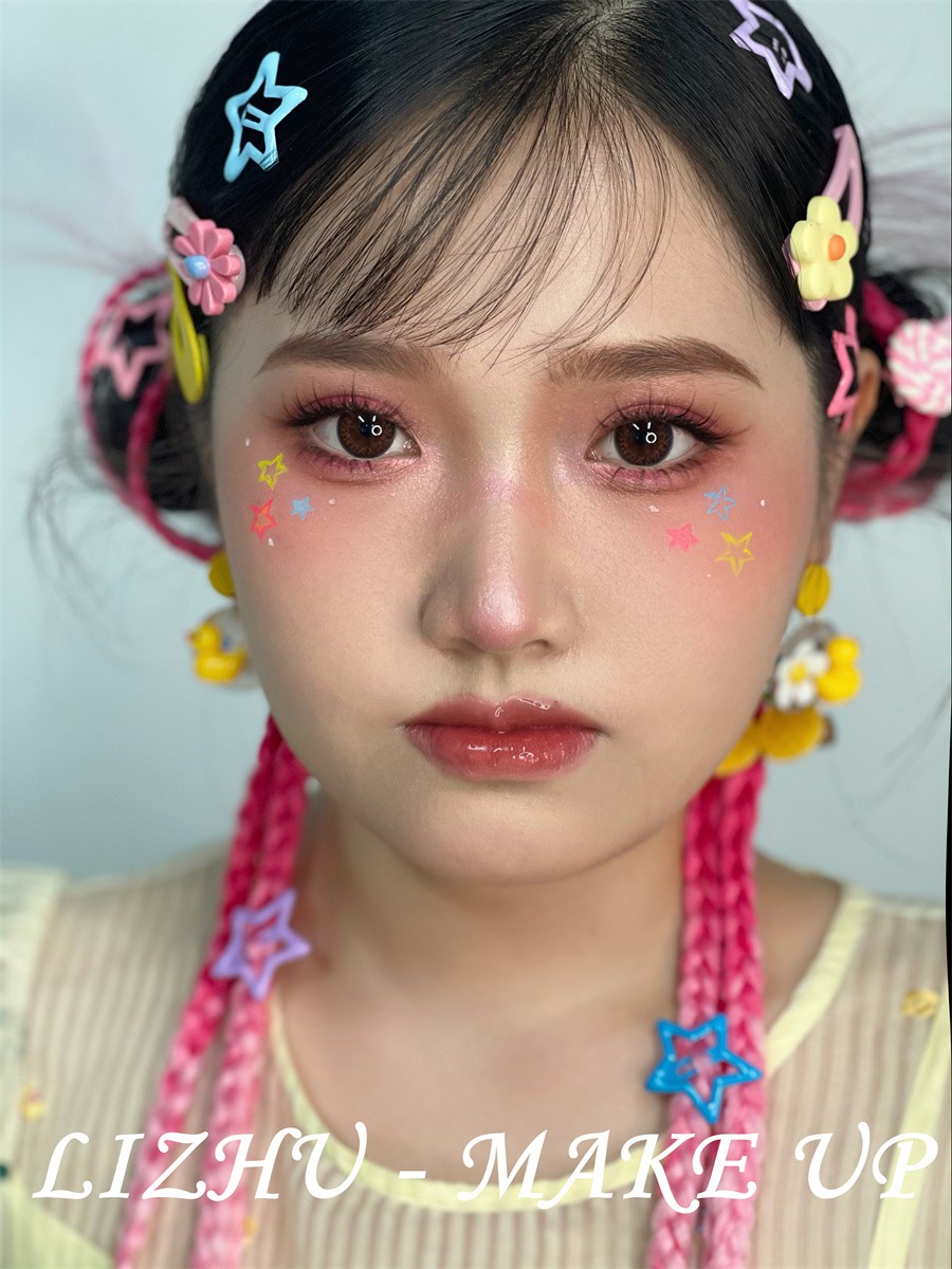 網(wǎng)紅妝容圖片、廣西化妝彩妝培訓(xùn):多巴胺風(fēng)格,主要是指通過顏色搭配營造出一種愉悅感的風(fēng)格。對(duì)高飽和度的色彩進(jìn)行協(xié)調(diào)搭配,于鮮亮彩色中尋求協(xié)調(diào)與平衡,這樣打造出的容造型總能給人一種可愛,童趣,快樂的感覺。