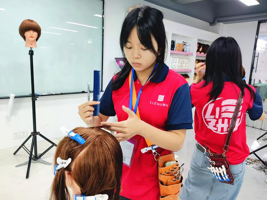 看完課堂上老師的手法示范,廣西美發(fā)培訓(xùn)班的同學(xué)進行頭模練習(xí)