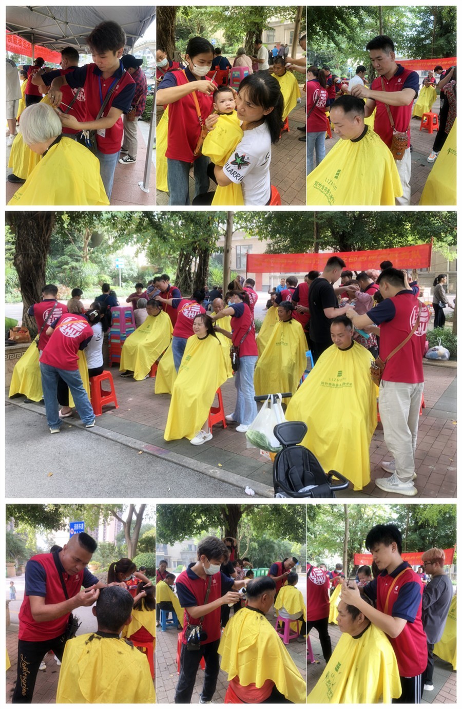 美發(fā)外出實(shí)踐、南寧理發(fā)培訓(xùn)教學(xué):南寧美發(fā)正規(guī)學(xué)校-以及在南寧美發(fā)學(xué)校學(xué)理發(fā)的同學(xué)們,共同組成南寧美發(fā)志愿者服務(wù)隊(duì)走進(jìn)奧園社區(qū)和恒大翡翠華庭小區(qū),在重陽(yáng)節(jié)為居民們愛心理發(fā),送去節(jié)日的溫暖。
