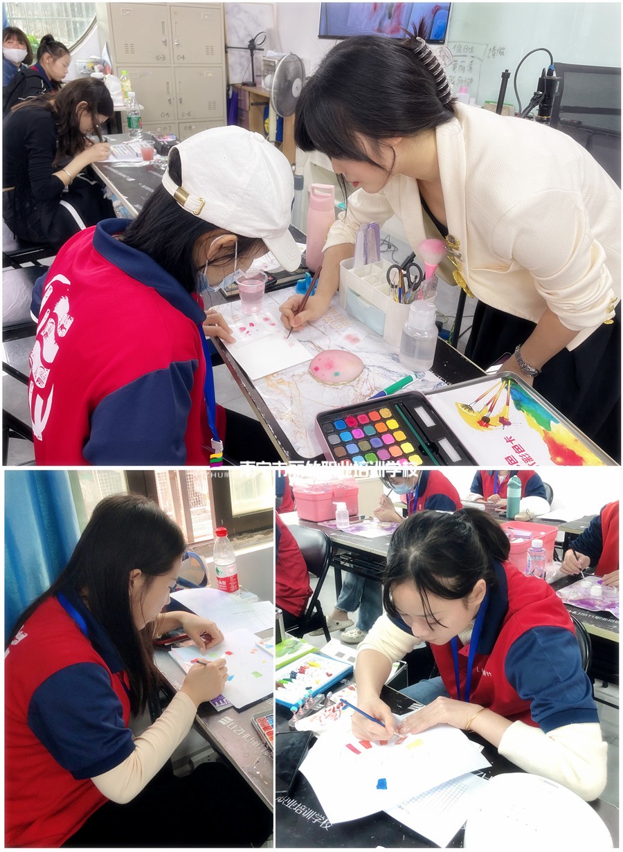 南寧專業(yè)美甲師課程-在小葵老師的教導下,同學們不僅學到了美甲暈染的常用方法以及網紅款式,還學到了水彩的調色方法(玫瑰花,竹子的畫法),水彩與甲油膠快速暈染技法、以及水彩暈染與彩繪花卉的搭配技法。