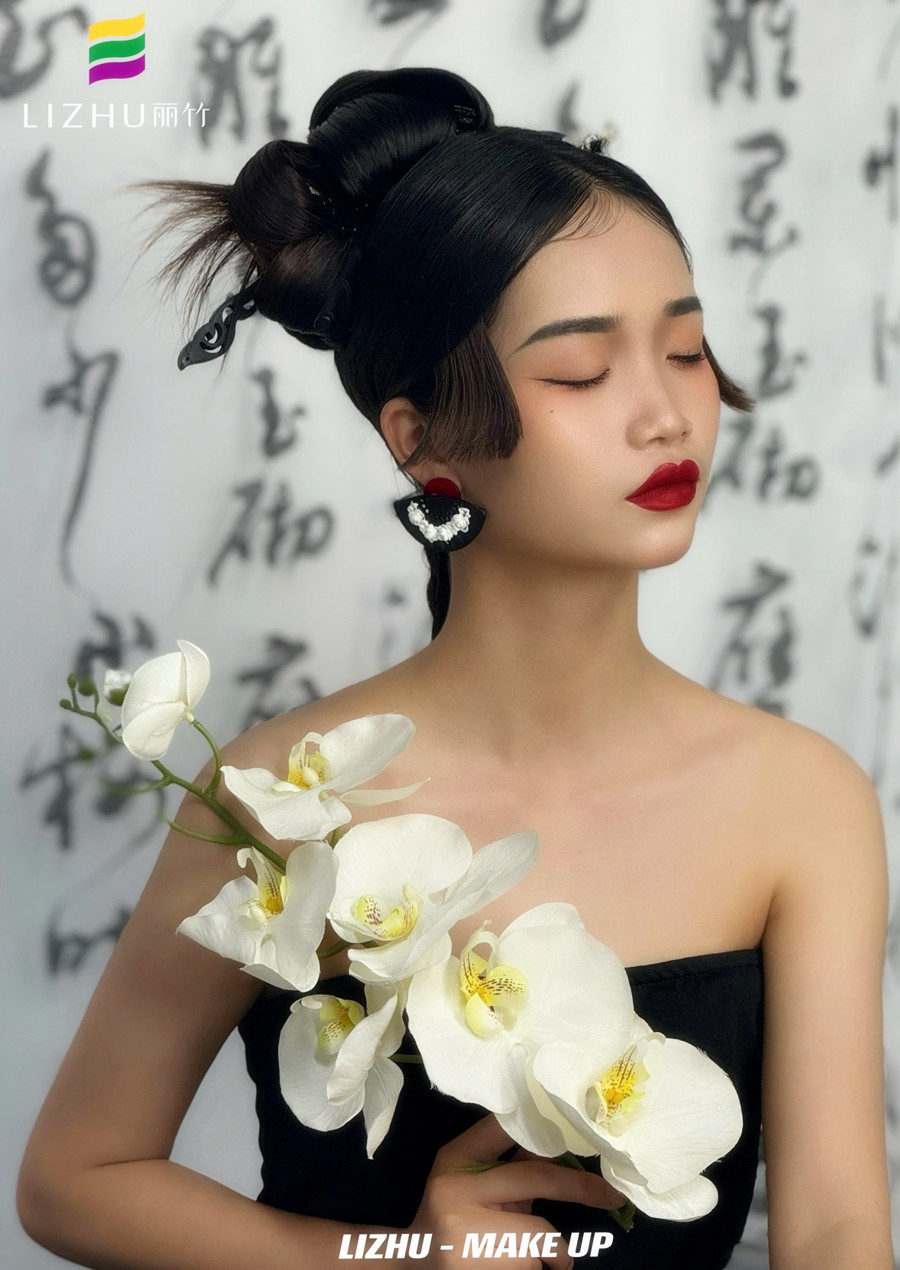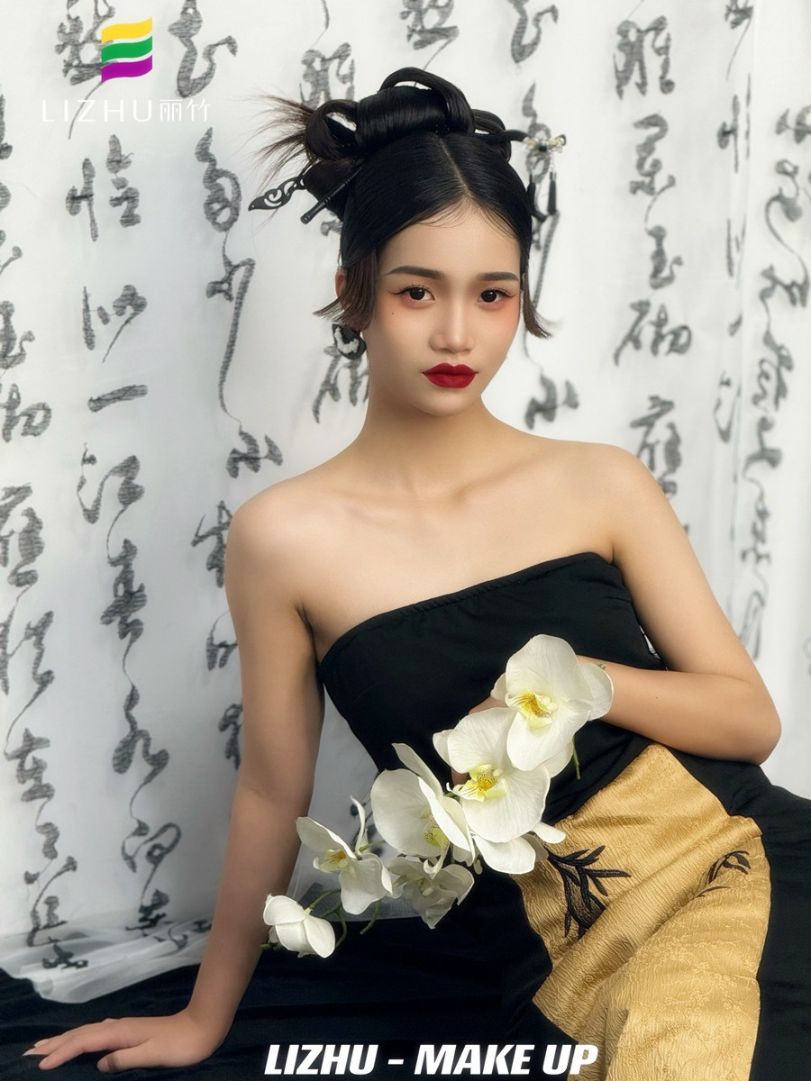 南寧新娘化妝師培訓(xùn)、南寧寫真化妝學(xué)習(xí)作品---新中式造型:一套改良版露肩中式套裝,搭配簡約利落中式盤頭,將東方的優(yōu)雅和現(xiàn)代女性風(fēng)格融合,整個(gè)造型流露出一種文人筆墨下的詩意。如果你想近期在南寧學(xué)新娘化妝,那么千萬不要錯(cuò)過南寧人物寫真化妝學(xué)校-麗竹學(xué)校年末感恩答謝會(huì)的學(xué)費(fèi)特惠福利啦!