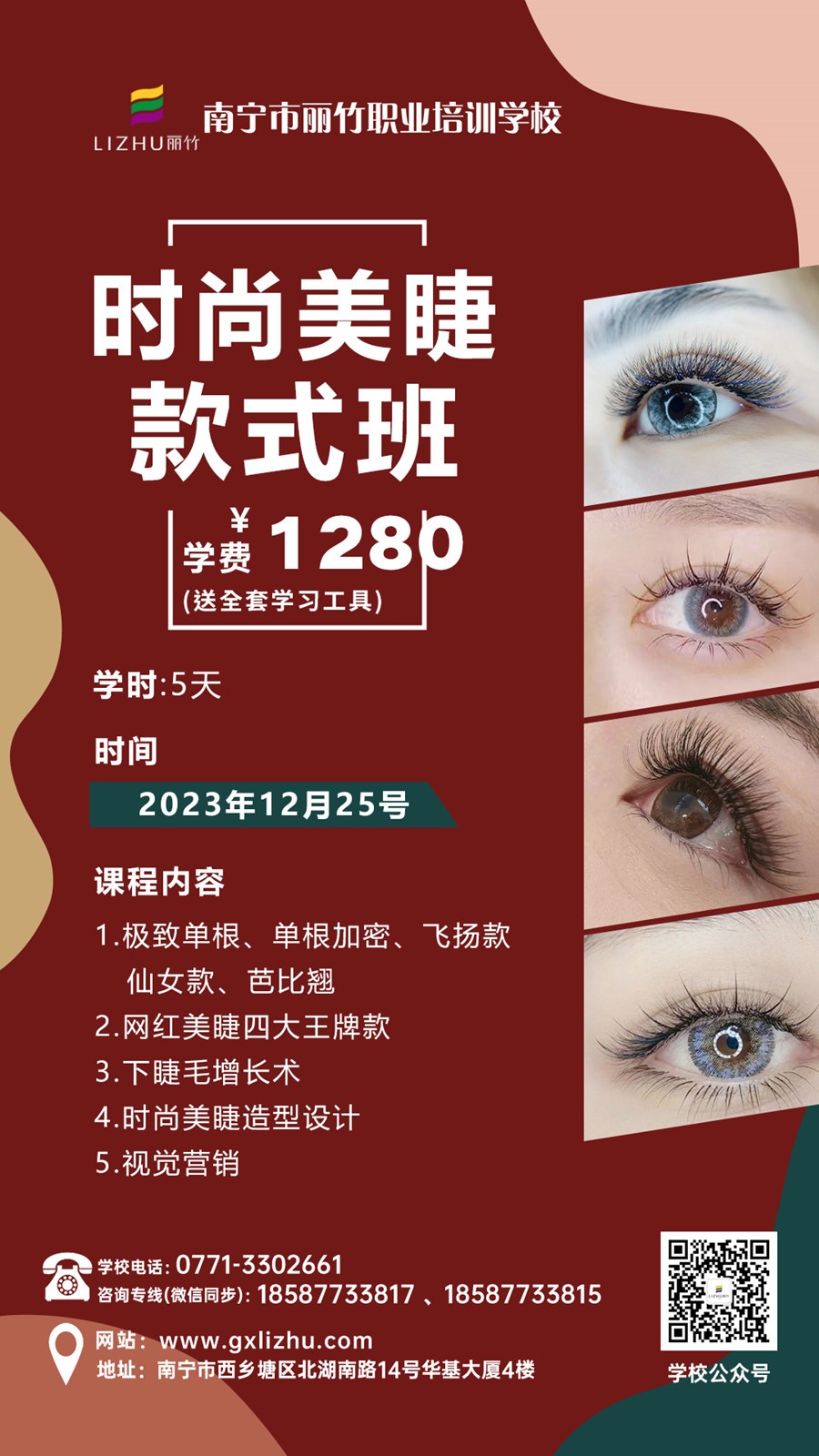 如果你是上述的人群之一,那么你就是適合學習美睫的人群啦!所以,千萬不要錯過學時短,學費親民,易上手,引流拓客快速的美睫項目啦!南寧專業(yè)培訓美睫師(麗竹時尚美睫款式班)將于12月25日正式開班,現(xiàn)在報名不僅可以享受親民學費,還能送全套學習工具哦,把握現(xiàn)在趕緊報名吧!