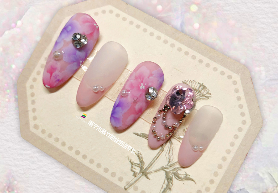 南寧美甲學(xué)習(xí)、南寧美甲師:花朵,也是美甲作品的常用元素之一。而在日常生活中,我們見(jiàn)到的花朵美甲技法大多采用單色或雙色漸變的方法進(jìn)行描繪。在南寧美甲款式進(jìn)修的課堂上,不妨和我們一起去看看南寧培訓(xùn)美甲班里老師的制作的兩款南寧美甲店里南寧美甲學(xué)徒必學(xué)的暈染花朵美甲作品吧!