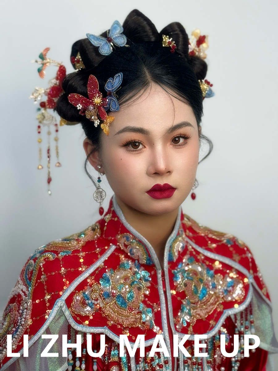 廣西學新娘妝、廣西新娘妝跟妝:明艷動人的底妝,亮眼的紅唇描繪彰顯氣場,中式卷筒發(fā)髻,配上寓意喜慶和美好的珠釵花朵蝴蝶發(fā)飾,穿上采用傳統(tǒng)紅色作為主色調(diào)之余,配以不同色系的亮片鑲嵌在衣服上,肩膀使用披肩設計點綴,使得整個造型更加精致和吸睛。