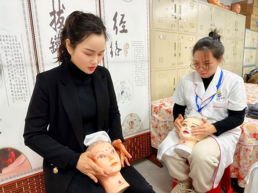 南寧皮膚管理護膚班同學跟著老師在假頭模上進行手法練習