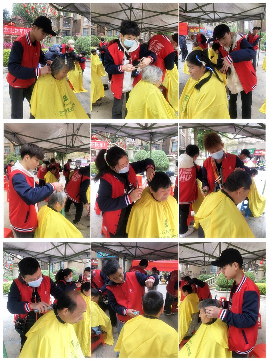 廣西理發(fā)實踐、廣西美發(fā)社會活動免費:3月初始,廣西理發(fā)師學校(麗竹美發(fā)學校)-廣西美發(fā)培訓班的志愿者們在黃老師的帶領(lǐng)下,不畏嚴寒,來到普羅旺斯小區(qū)為居民們送上了暖冬的慰問,在中心廣場上舉行免費理發(fā)活動。