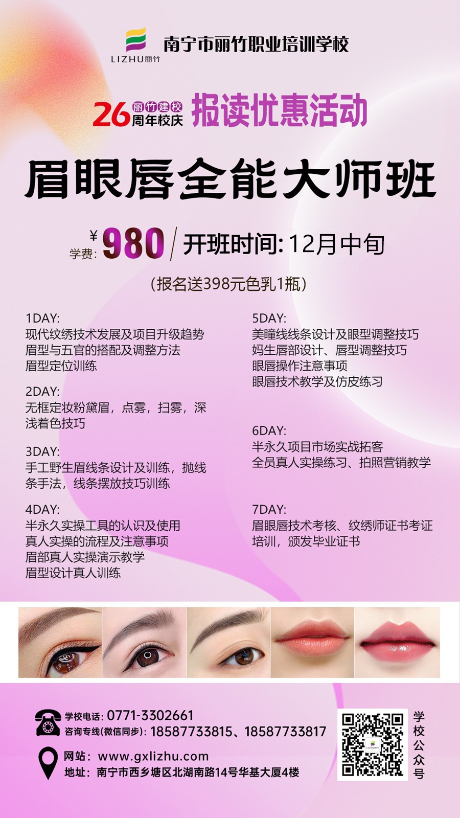 年前給自己一個快速學(xué)習(xí)一門技術(shù)的機會,抓住今年的尾巴,為新一年的到來開個好頭。南寧紋繡師培訓(xùn)-麗竹學(xué)校12月紋繡全能班(眉眼唇全能大師班)啟動開班招生中,現(xiàn)在報名僅需980元,還能額外贈送398元色乳1瓶。想在南寧學(xué)紋繡的小伙伴,趕緊聯(lián)系我們報預(yù)定學(xué)習(xí)名額的吧!