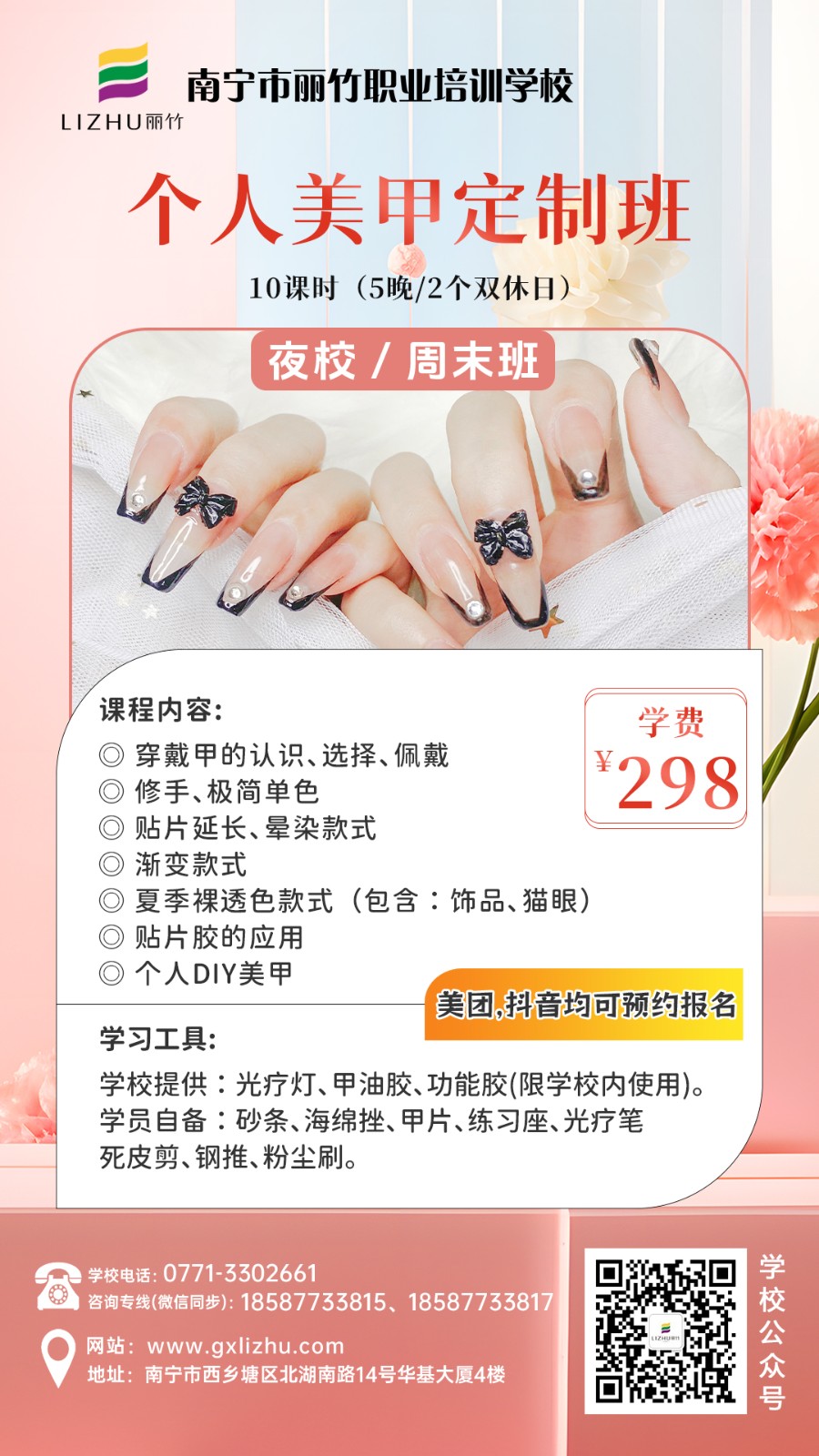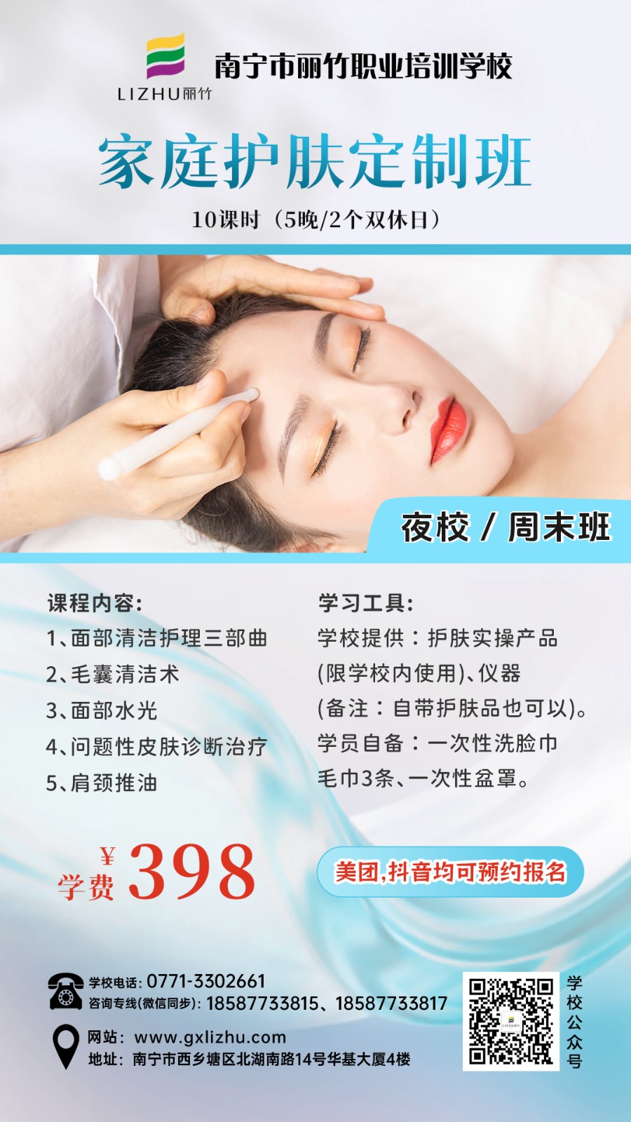 南寧美業(yè)技術(shù)培訓(xùn)學校-麗竹學校特色課程推薦---夜班/周末班,來咯![慶祝][太陽]無論你是上班族,寶媽,自由從業(yè)者……無論你想周末上課,還是上晚課,統(tǒng)統(tǒng)都由你說了算?。?/span>