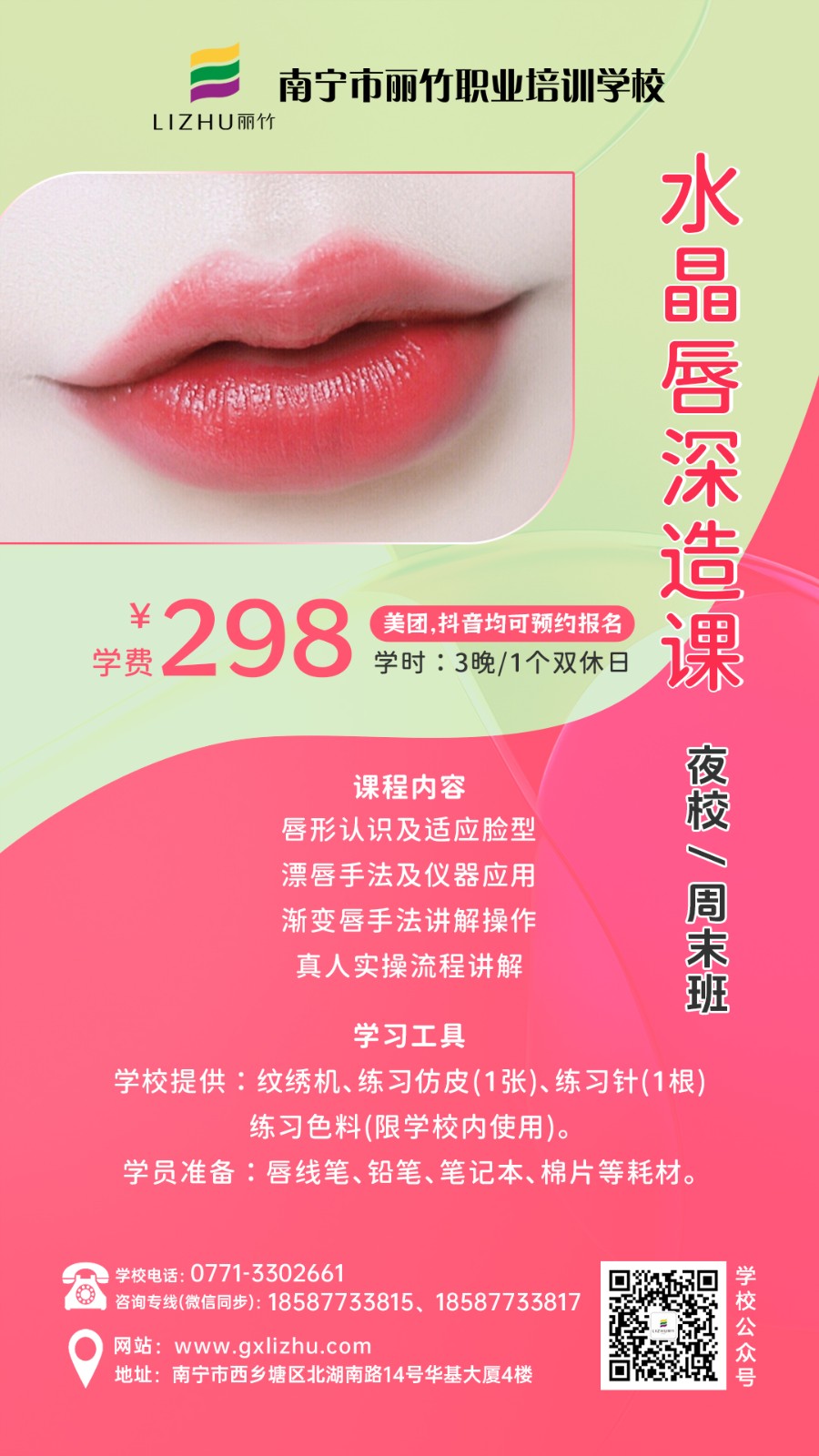 南寧美業(yè)技術(shù)培訓(xùn)學校-麗竹學校特色課程推薦---夜班/周末班,來咯!南寧化妝培訓(xùn)學校(個人形象化妝班)、南寧美甲培訓(xùn)學校(個人美甲定制班)、南寧美容護膚培訓(xùn)學校(家庭護膚定制班)、南寧紋繡培訓(xùn)(水晶唇深造課)、南寧眉眼唇培訓(xùn)學校(眉眼定制課)。