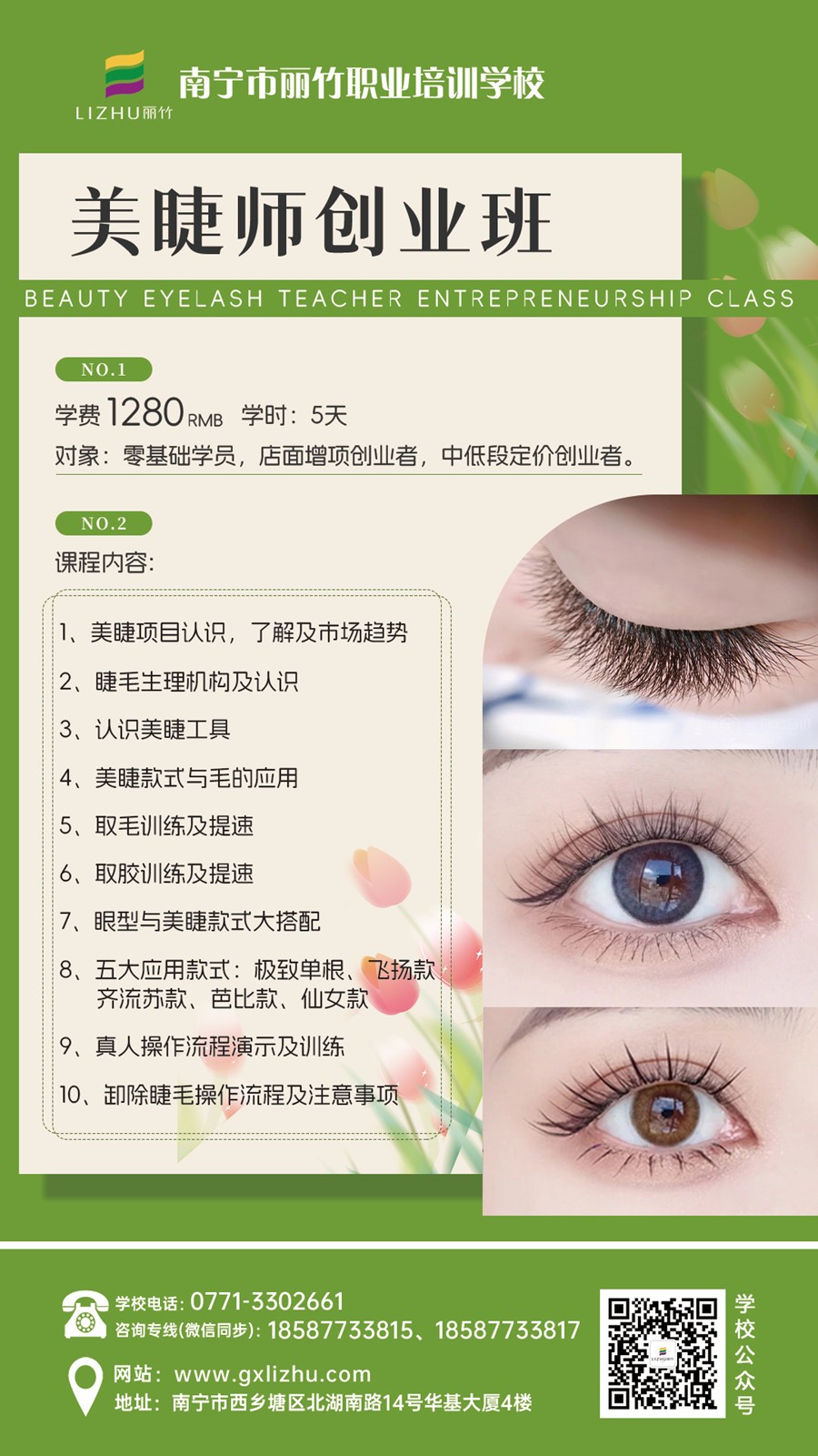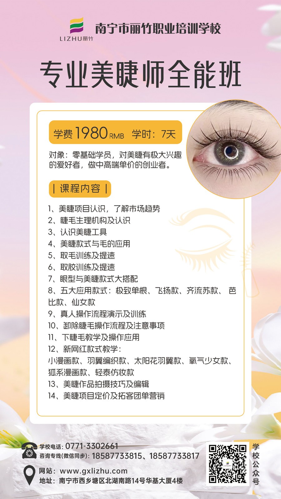 南寧美睫師、零基礎(chǔ)學(xué)美睫:寧美睫培訓(xùn)學(xué)校-麗竹學(xué)校美睫課程教學(xué)技術(shù)成功全面升級(jí)!美睫學(xué)費(fèi)優(yōu)惠活動(dòng)持續(xù)進(jìn)行,截止日期為5月30日。如果你想在南寧學(xué)美睫,想做南寧美睫培訓(xùn)學(xué)費(fèi)哪里便宜?那現(xiàn)在就不要猶豫,趕緊聯(lián)系我們報(bào)名吧!拼手速的時(shí)候就是現(xiàn)在。畢竟,你還在猶豫不決時(shí),別人已經(jīng)開(kāi)始行動(dòng)了。